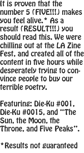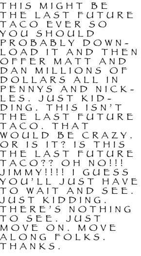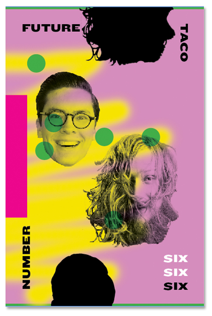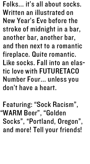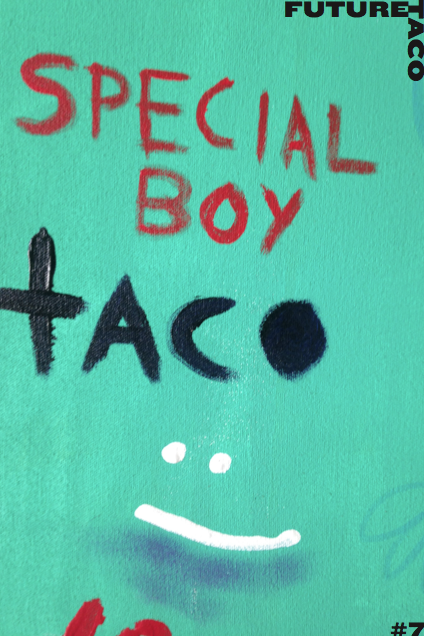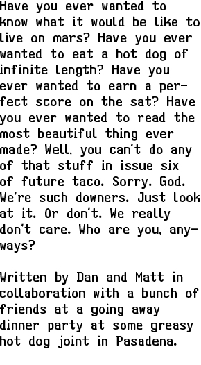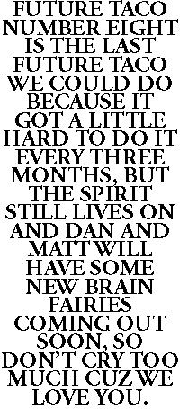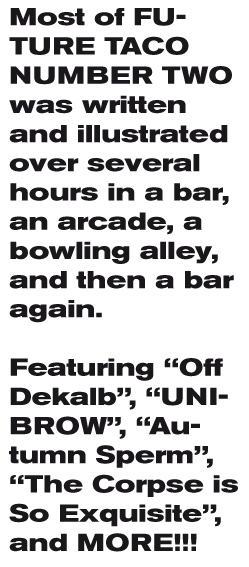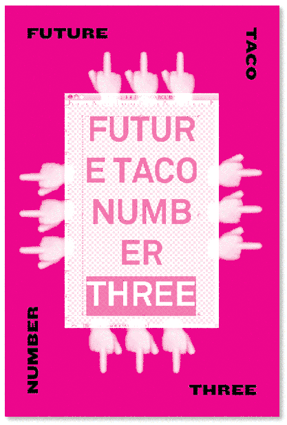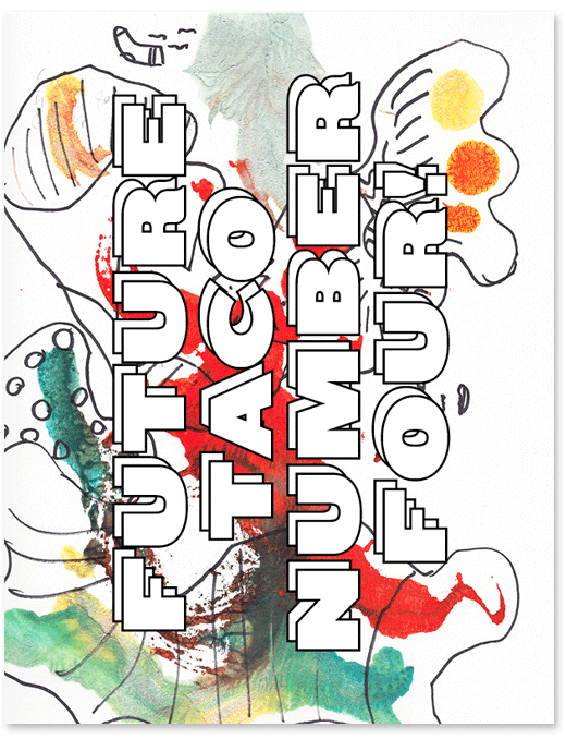 is a quarterly zine is a collection of eight asporationally poetic doodle dropping brain fairies swinging and swaying from clouds of cheese and pumpkin seeds spread across sheets of pink foil ripped like gray hair lacing bank statements long overdue from flippy flop floop flipple flap. FUTURE TACO explores spontaneity, stream of consciousness, and the documentation of singular moments within the tick tock of a click clockâs wooden bench stained in ketchup colored newspaper delivered fresh at doorsteps paved in green grass.